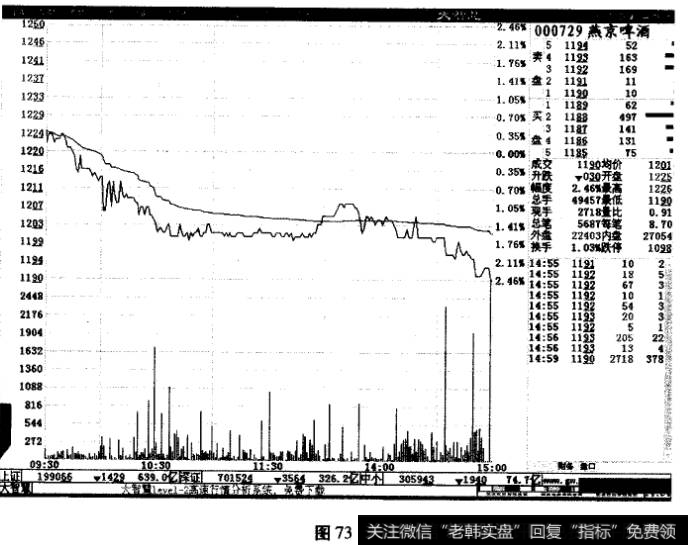 采用打压方式建仓的个股,分时走势图上也会呈现出一些比较明显的特征。如果股价在这个过程中是直线式下跌的话,那么在分时走势上,股价就会经常出现单边下跌的走势。在庄家建仓的整个阶段,股价在分时图上的运行轨迹,大部分时间都是在日平均线以下运行的,日平均线在大部分的时间里都是阻碍股价上涨的压力线(如图73所示)。有的时候,股价某一天会出现大幅度低开低走的态势,分时走势图上显示的买盘非常低迷,而卖盘却在不断地涌出,导致股价一路下跌。凶狠的庄家一开盘就会把股价打压至跌停板,并且整天都不会打开跌停板,这样,分时走势图上就会呈现出一条直线的走势。