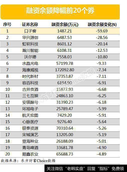 与之形成对比的是,当日有545股融资余额出现下降。其中,融资余额降幅超过3%的有35只。口子窖的融资余额降幅最大,最新融资余额1487.21万元,与前一个交易日相比,融资余额下降了59.9%。另外,融资余额降幅较大的个股还有华兴源创、虹软科技等,融资余额分别下降了28.56%、20.14%。