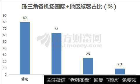 而从各个机场自身的国际+地区旅客占比来看,香港机场占到80%,澳门机场为63%,白云机场为25%,深圳机场只有9.3%。