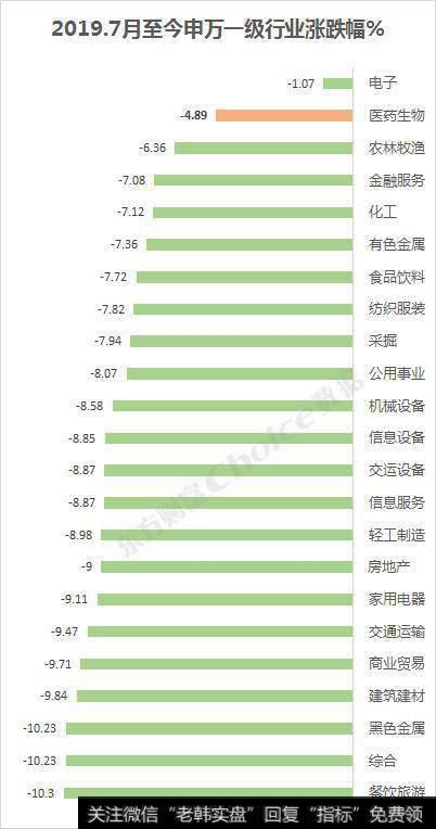 7月份以来,A股各行业呈现普跌态势,但是医药生物行业在申万一级行业中表现依旧亮眼,跌幅仅次于电子行业,排名第二。