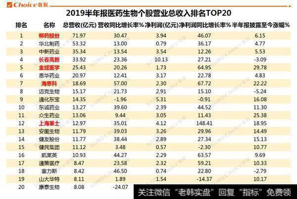 在2019半年报医药生物个股营业总收入排名TOP20中,营收总额最高的是柳药股份,上半年总营收71.97亿元;但营收同比增长最高的却是海思科,上半年总营收18.69亿元,同比增长57%。