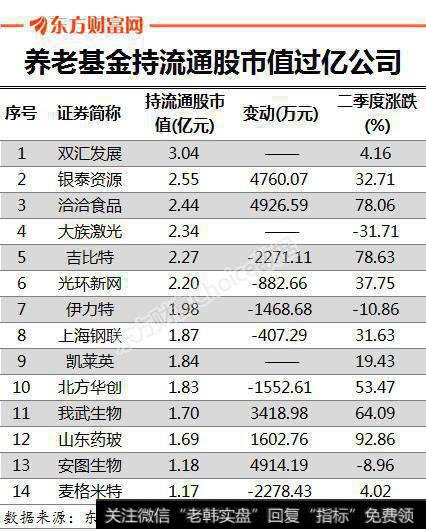 其中14家公司养老基金持流通股市值过亿,二季度新进公司双汇发展是养老金目前持流通市值最高的公司,为3.04亿元。此外,二季度养老金新进持有大族激光和凯莱英的流通市值也是过亿的,分别为2.34亿元和1.84亿元。