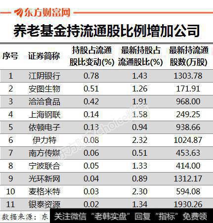 从养老基金持股占流通股比变动来看,其中11家公司持股占流通股比是增加的,江阴银行居首,持股占比增加0.78%,最新持有流通股数1303.78万股。紧随其后的是安图生物,养老基金持股占流通股比增加0.51%,最新持有流通股171.91万股。