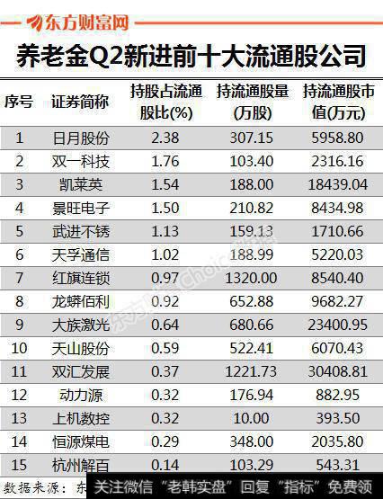 当然,也有15家公司是养老基金二季度新进前十大流通股公司,其中日月股份最新持股占流通股比例最高,为2.38%,持仓市值为5958.8万元。此外,像双一科技、凯莱英、景旺电子、武进不锈和天孚通信等公司,养老基金最新持股占流通股比也均超过1%。
