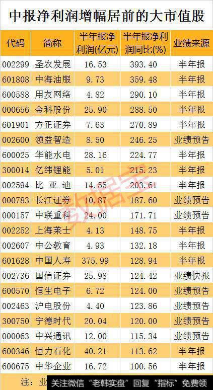 与去年同期对比来看,上述149只大市值股中约76.5%半年报业绩正增长,其中21股净利翻番。已公布半年报及业绩快报的公司中,净利润增幅最高的是圣农发展,上半年公司实现盈利16.53亿元,同比增长393.4%,净利润增速创上市以来同期历史最高水平。圣农发展表示业绩大幅增长主因为肉鸡行业景气度持续攀升。中海油服上半年盈利9.73亿元,同比扭亏为盈。用友网络上半年实现盈利4.82亿元,同比增长290.1%。