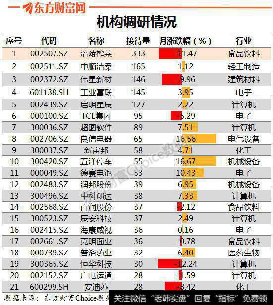 作为本月最受机构青睐的个股,涪陵榨菜获群益投信、凯基投信、远雄人寿、施罗德基金、野村投信等高达333家机构调研,累计接待机构数量位居首位。