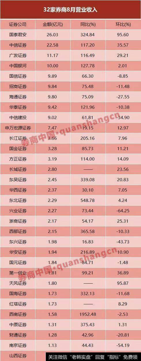 就单月营收来看,有四家券商超10亿元。由于收到上海证券15.3亿元的分红款,国泰君安8月份实现26.03亿元,环比增幅95.6%,排名第一;中信证券22.58亿元的环比增幅35.57%,排名第二;广发证券和银河证券单月营收分别为11.17亿元和10亿元,环比增幅29.21%以及2%。