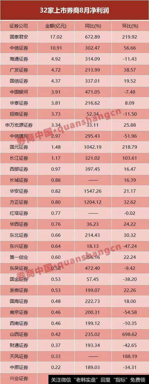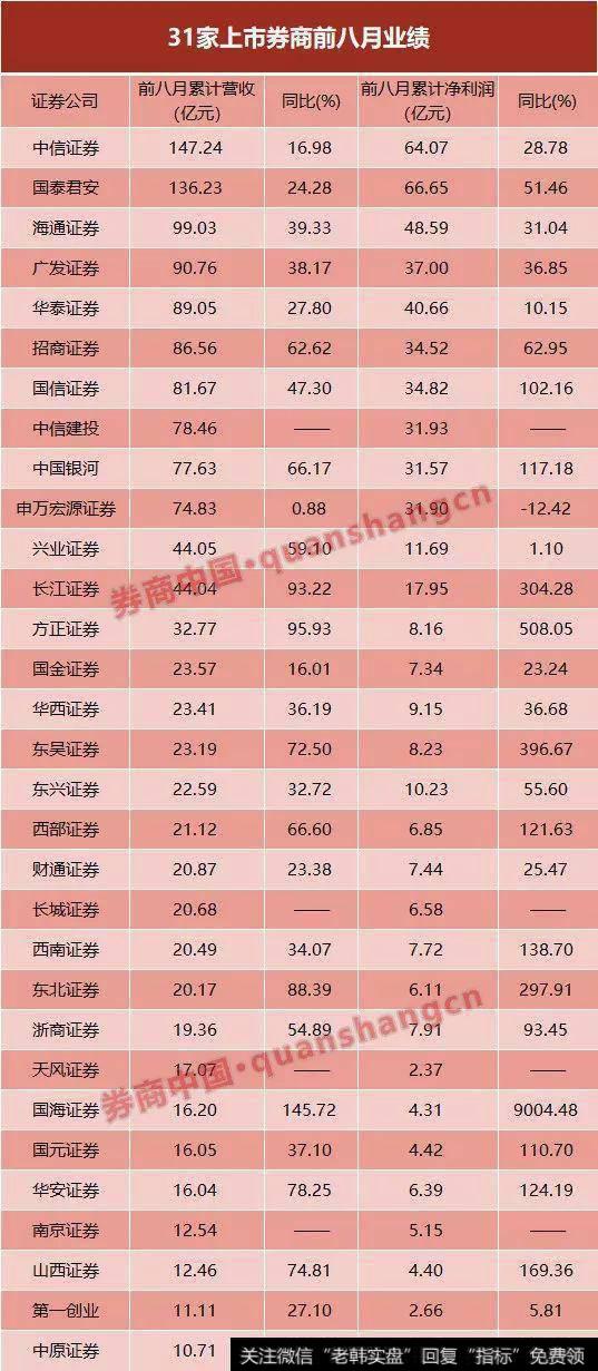 净利润同比增幅来看,32家券商中只有申万宏源证券一家同比下滑,31.9亿元的净利润下滑12%;国海证券、方正证券、东吴证券前八月净利润同比增幅明显。