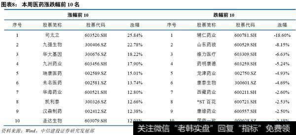 个股方面,本周涨幅前5分别为司太立(+25.84%)、九强生物(+22.78%)、华大基因(+18.22%)、九洲药业(+17.90%)和瑞康医药(+15.01%),本周跌幅前5分别为辅仁药业(-18.60%)、山东药玻(-8.15%)、维力医疗(-6.63%)、药明康德(-5.24%)和龙津药业(-4.93%)。