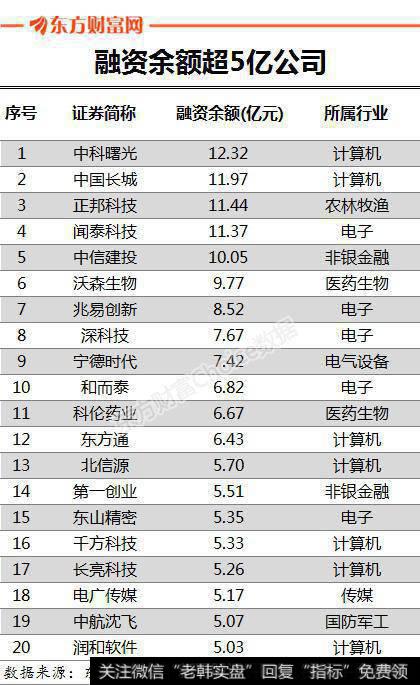 具体到个股,东方财富Choice数据显示,新增的650家两融标的股中,截至9月18日,有273家公司融资余额过亿,其中20家公司更是超过5亿,中科曙光、中国长城、正邦科技、闻泰科技、中信建投5家公司更是超过10亿,分别为12.32亿、11.97亿、12.04亿、11.37亿和10.05亿。