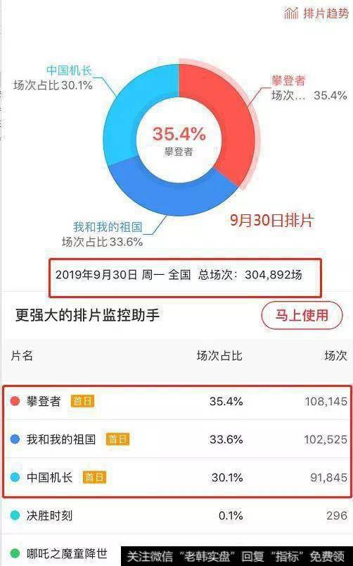 从首日排片来看,三大影片也是旗鼓相当。9月30日当天,《攀登者》、《我和我的祖国》、《中国机长》的排片场次分别为10.81万场次、10.25万场次、9.18万场次,场次占比分别为35.4%、33.6%、30.1%,合计占首日场次的99.1%。