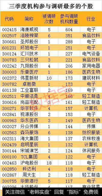 从行业来看,三季度科技类个股仍最受机构关注。在参与调研机构数量最高的前100只个股中,有26只是电子行业个股,13只是计算机行业个股,再加上3只通信类个股,三者合计42只,几乎快占到二分之一。此外,还有9只是医药生物。