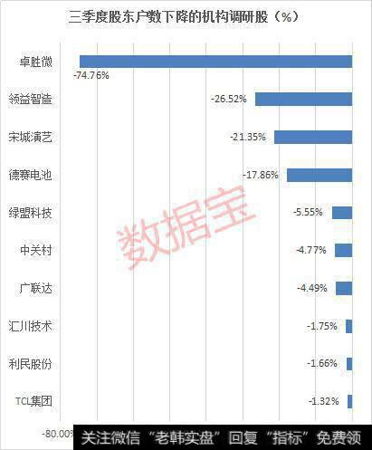 卓胜微三季度股东户数从半年报的4.94万户下降到最新的1.25万户,降幅74%,是下降最多的个股。不过,公司半年报时还在新股上市连续涨停中,股东户数大幅下降在情理之中。另外,领益智造三季度股东户数下降26%,宋城演艺下降21%。