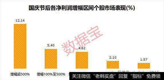 证券时报·数据宝统计发现,净利润增幅越大的个股,节后平均涨幅越高。按照净利润预计增幅中值计算,净利润增幅中值超500%的个股国庆节后表现最为强劲,17股平均上涨12.14%。如天顺股份预计前三季净利润增幅超过50倍,节后录得3连板,股价涨幅33.15%;光正集团预计前三季净利润扭亏,节后累计上涨22.18%。