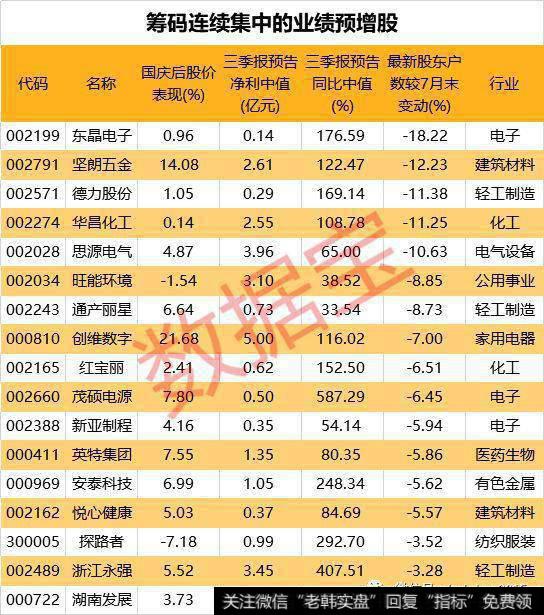 值得一提的是,上述个股中的坚朗五金、东晶电子自7月末以来,股东户数连续2月下降。进一步梳理发现,三季报预计净利润增幅中值超30%,且筹码连续2月集中个股共计17只,这17股最新股东户数较7月末降幅均超过3%。