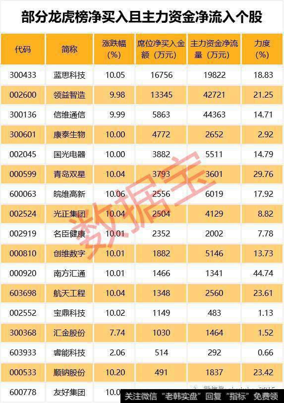 从盘口资金流向来看,主力资金净流入超千万且龙虎榜净买入个股共有15只,其中信维通信、领益智造、蓝思科技等个股资金净流入金额最大。净流入力度最大的个股有南方汇通、友好集团、青岛双星,净流入力度分别为44.74%、41.39%、29.76%。