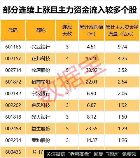 值得注意的是,975只连续上涨个股中,11只个股期间主力资金累计净流入超过亿元。其中,累计资金流入最多的为兴业银行,主力资金累计流入9.74亿元。