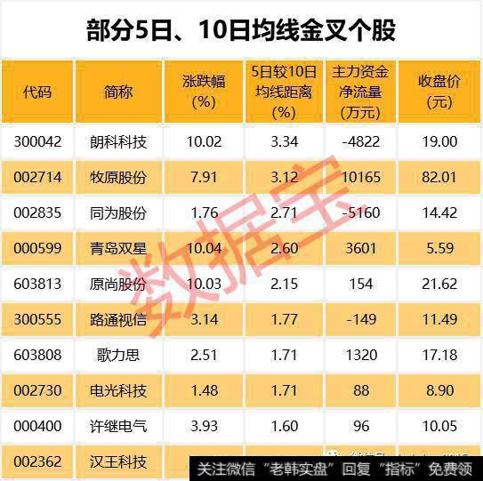 截至10月10日收盘,有78只A股的5日均线主动上穿10日均线,其中朗科科技、牧原股份、同为股份等个股的5日均线较10日均线距离最大,分别达3.34%、3.12%、2.71%。