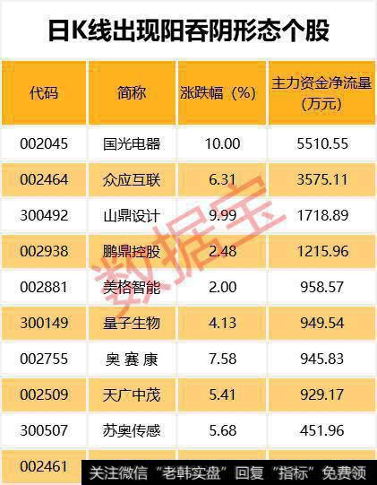 截至10月10日收盘,两市共有21只个股日K线出现阳吞阴形态,当天涨幅最大的是国光电器、山鼎设计、大金重工,涨幅分别为10%、9.99%、9.52%。