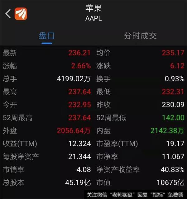 美国当地时间10月11日,苹果以232.95美元的开盘价跳空高开,盘中一度达到237.64美元的历史新高,收盘时股价小幅下跌,收盘报236.21美元,创下收盘价新高,单日上涨6.12美元,涨幅2.66%,市值达10675亿美元,比微软市值10665亿美元高出10亿美元,重回美股市值第一宝座。