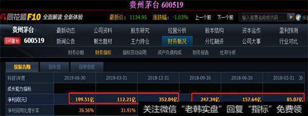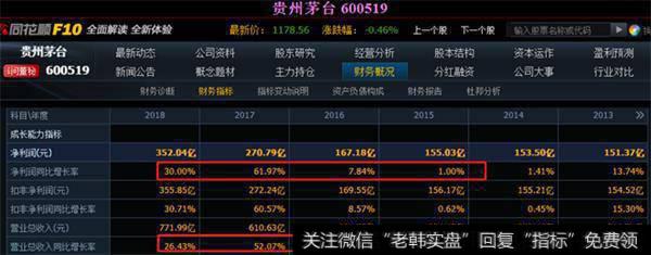 以贵州茅台为例,各季度净利润都在稳定增长,净利润同比增长率也比较均匀。可以得出结论;在最近这几年这是一家连续创造利润的稳健型企业。在这种稳健增长的背景下,我们可以预期未来的若干个季度,它的业绩同样会匀速前进,这就为投资提供了业绩层面的预期支撑。