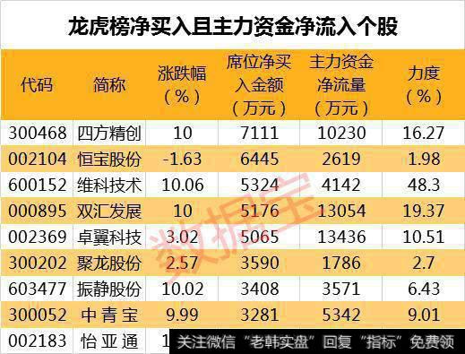 从盘口资金流向来看,主力资金净流入超五千万且龙虎榜净买入个股共有10只,其中卓翼科技、双汇发展、四方精创等个股资金净流入金额最大。净流入力度最大的个股有新湖中宝、维科技术、宁波建工,净流入力度分别为68.2%、48.3%、35.38%。