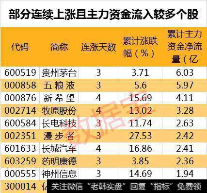 值得注意的是,308只连续上涨个股中,27只个股期间主力资金累计净流入超过亿元。其中,累计资金流入最多的为贵州茅台,主力资金累计流入6.03亿元。