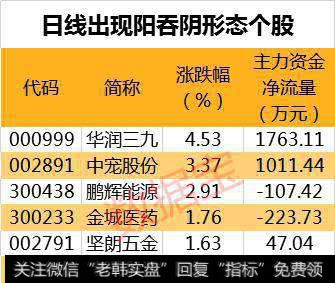 统计数据显示,截至10月29日收盘,两市共有6只个股日K线出现阳吞阴形态,当天涨幅最大的是华润三九、中宠股份、鹏辉能源,涨幅分别为4.53%、3.37%、2.91%。