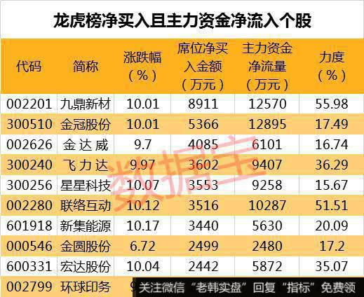 从盘口资金流向来看,主力资金净流入超千万且龙虎榜净买入个股共有11只,其中金冠股份、九鼎新材、新湖中宝等个股资金净流入金额最大。净流入力度最大的个股有九鼎新材、联络互动、飞力达,净流入力度分别为55.98%、51.51%、36.29%。
