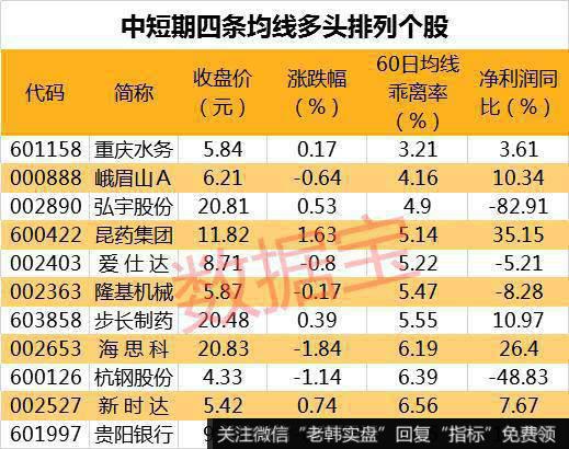 截至最新,99只个股5日、10日、20日、60日四条均线近日呈多头排列。其中重庆水务、峨眉山A、弘宇股份股价与60日均线的乖离率最小,分别为3.21%、4.16%、4.9%。