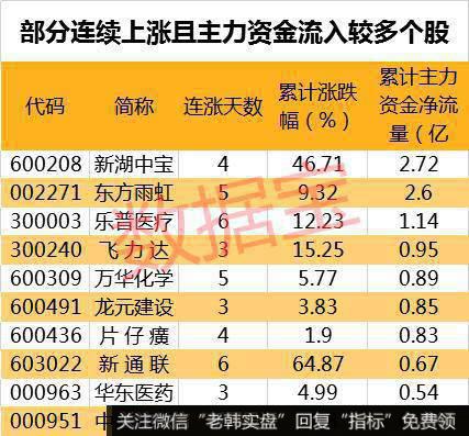 值得注意的是,63只连续上涨个股中,3只个股期间主力资金累计净流入超过亿元。其中,累计资金流入最多的为新湖中宝,主力资金累计流入2.72亿元。