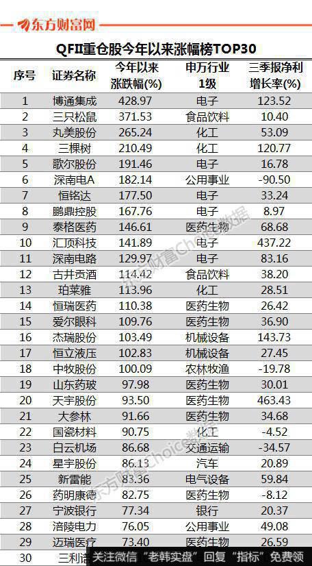 从QFII重仓股今年以来涨幅排行来看,博通集成、三只松鼠、丸美股份、三棵树等涨幅超200%;歌尔股份、深南电A、恒铭达、鹏鼎控股、泰格医药等14只个股涨幅超100%。