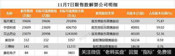 11月7日,两市共有6家公司限售股解禁,具体解禁公司包括海天精工、宇信科技等。其中海天精工解禁可流通股数量为39606万股,占其总股本比例为75.87%。