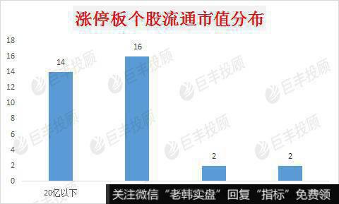 从流通市值的角度看,中小流通市值仍是出现涨停股数量最多的区域,50亿以下流通市值的个股数量达到30家,其中只有14家企业的流通市值在20亿以下,流通市值在50-100亿之间的个股数量今天出现2家,流通市值超百亿的个股出现2家。