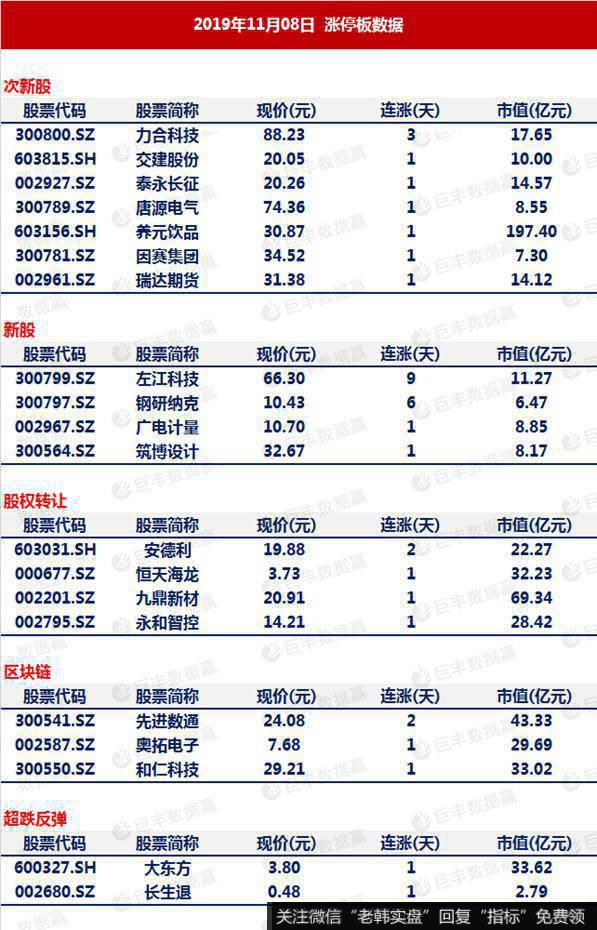 区块链概念重回巅峰仅仅坚持了一天,也开始跟随市场的风格,回到一日游的走势,同时由于个股龙头易主,区块链概念已经开始沦为配角,今天次新股概念表现偏强,而三连板的力合科技目前是市场的个股高度,所以对次新股来说,是个利好。同时由于次新股的股价和流通市值也符合目前市场的风格,所以一些中高价股及小流通市值个股如果迭加次新股概念,可能会更好,只是还要警惕目前市场的概念持续性,毕竟最近概念的持续性一直偏低,除此之外,股权转让概念今天出现三只首板个股,也是目前市场的小热点。