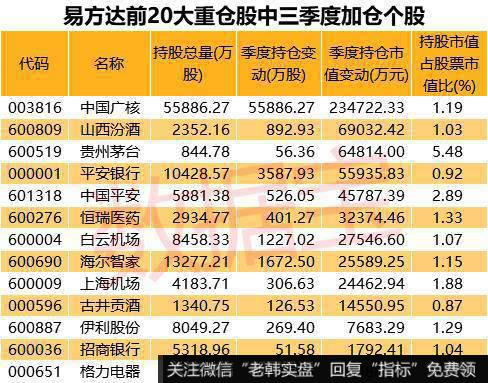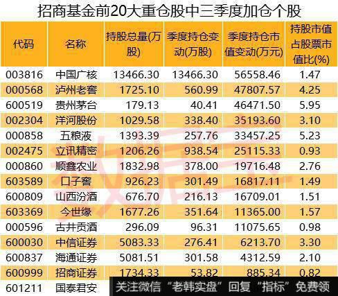 前20大重仓股中,加仓15股,中国广核被买入1.35亿股,三季度末市值5.66亿元排名第一;其他加仓较多的还有泸州老窖、贵州茅台、洋河股份、五粮液等白酒股,加仓市值都超过了3亿元,其他白酒股口子窖、山西汾酒、今世缘、古井贡酒等也被不同程度加仓。