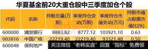 前20大重仓股中,仅3只被加仓,浦发银行、中国广核、保利地产被加仓市值分别为10.39亿元、9.33亿元和3003万元。