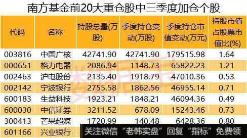 前20大重仓股中,8只被加仓,其中新买入中国广核4.27亿股,三季度末市值17.95亿元,远超其他个股排名第一;其他加仓较多的还有格力电器、沪电股份、宁波银行、生益科技,加仓市值都超过了4.5亿元。沪电股份和生益科技都属于科技板块的华为概念股,中国广核是新上市股票,格力电器则一直是机构资金看重的标的。