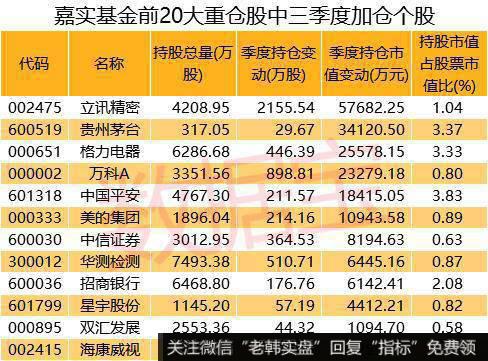 前20大重仓股中,12只被加仓,身兼华为、苹果、5G、智能音箱等多重概念的立讯精密被加仓股票市值5.77亿元排名第一;其他加仓较多的还有贵州茅台、格力电器、万科A、中国平安、美的集团等传统白马股。