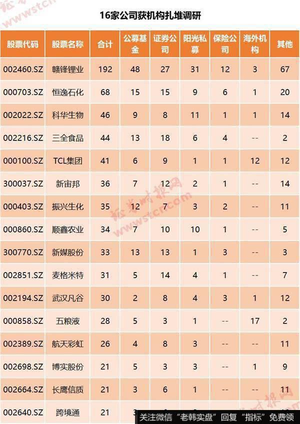 数据显示,个股方面,赣锋锂业上周累计接待机构192家,位列首位;恒逸石化累计接待68家机构,排名第二,科华生物累计接待46家机构,排名第三。
