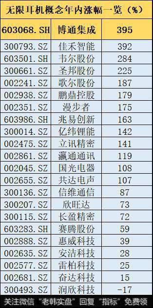 据记者梳理,根据Chioce数据,目前A股市场无线耳机概念个股共有22只,今年以来绝大多数取得较好的涨幅,今年以来截至11月12日平均涨幅(算术平均、不复权,下同)达136%!