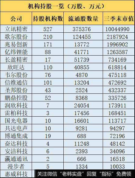 其中,立讯精密、歌尔股份、兆易创新、亿纬锂能、长盈精密、欣旺达、韦尔股份、信维通信这几只股票的机构持股数量和持股数量均靠前。