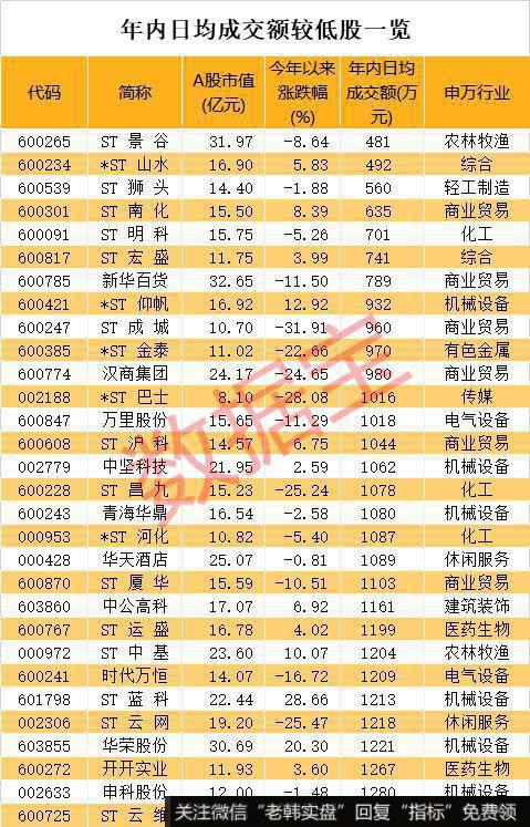 数据显示,不含今年上市的次新股及停牌个股,年内日均成交额不足0.2亿元的股票共计200只。11股年内日均成交额不足千万,如ST景谷、*ST山水、ST狮头、ST南化、ST明科、ST宏盛、新华百货等。