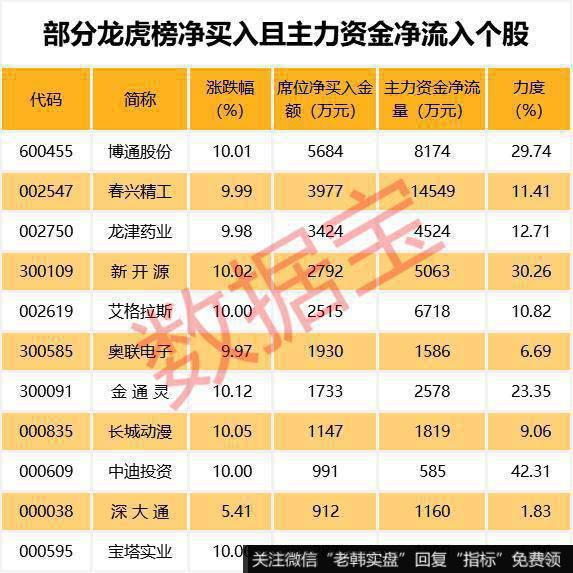 从盘口资金流向来看,主力资金净流入超千万且龙虎榜净买入个股共有10只,其中春兴精工、博通股份、艾格拉斯等个股资金净流入金额最大。净流入力度最大的个股有中迪投资、新开源、博通股份,净流入力度分别为42.31%、30.26%、29.74%。