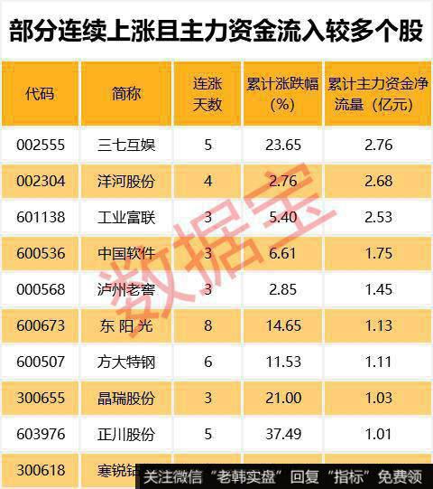 值得注意的是,266只连续上涨个股中,9只个股期间主力资金累计净流入超过亿元。其中,累计资金流入最多的为三七互娱,主力资金累计流入2.76亿元。