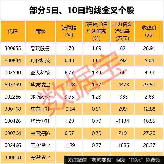 截至最新收盘,两市共有有18只A股的5日均线主动上穿10日均线,其中晶瑞股份、丹化科技、亚太科技等个股的5日均线较10日均线距离最大,分别达1.69%、1.61%、1.44%。值得注意的是,丹化科技、喜临门、东方日升等个股主力资金净流入居前。