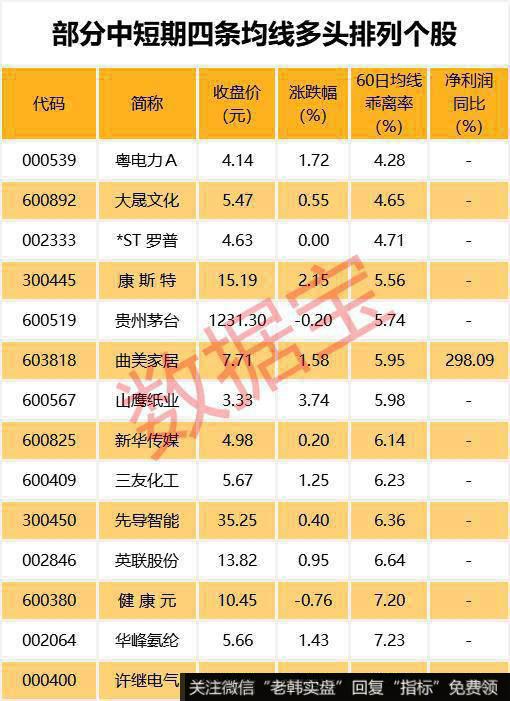 截至最新,两市有112只个股5日、10日、20日、60日四条均线近日呈多头排列。其中粤电力A、大晟文化、*ST罗普股价与60日均线的乖离率最小,分别为4.28%、4.65%、4.71%。
