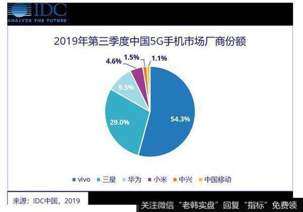 调研机构 IDC 上月公布的 2019 年第三季度中国 5G 手机出货量报告显示,今年第三季度中国5G手机整体出货量约48.5 万部,其中 vivo 以 54.3%的市场份额排名第一,三星和华为则分列第二、第三位。