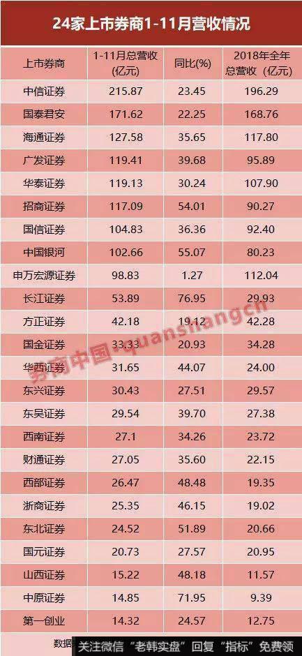 具体来看,在1-11月营收方面,中信证券以215.87亿元领跑行业,长期稳居头把交椅。国泰君安、海通证券等7家券商也均超过百亿水平。对比2018年情况来看,有同比数据的24家券商中,已有20家完成去年全年业绩;平均同比增幅达到38.12%,招商证券、银河证券、长江证券、东北证券、中原证券5家同比增幅甚至超过50%。