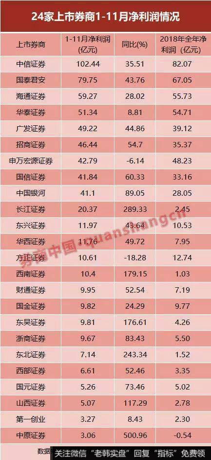 就具体排名来看,中信证券前11月已实现净利润102.44亿元,超出去年全年20亿元,国泰君安、海通证券、华泰证券三家1-11月净利润也超过50亿元,居于行业前列。